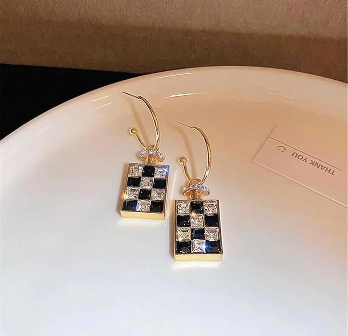 - DESIGN: Elegant checkerboard pattern earrings featuring alternating black and clear crystal squares in a gold-toned setting