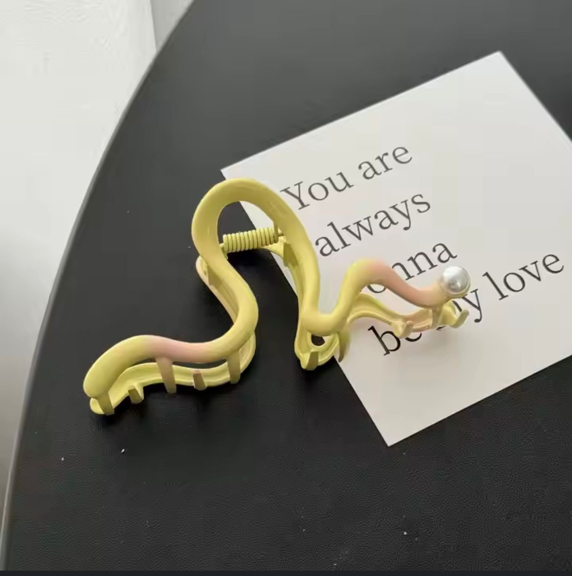 Elegant Pearl-Accented Hair Clutcher, Large Curved Design, Yellow