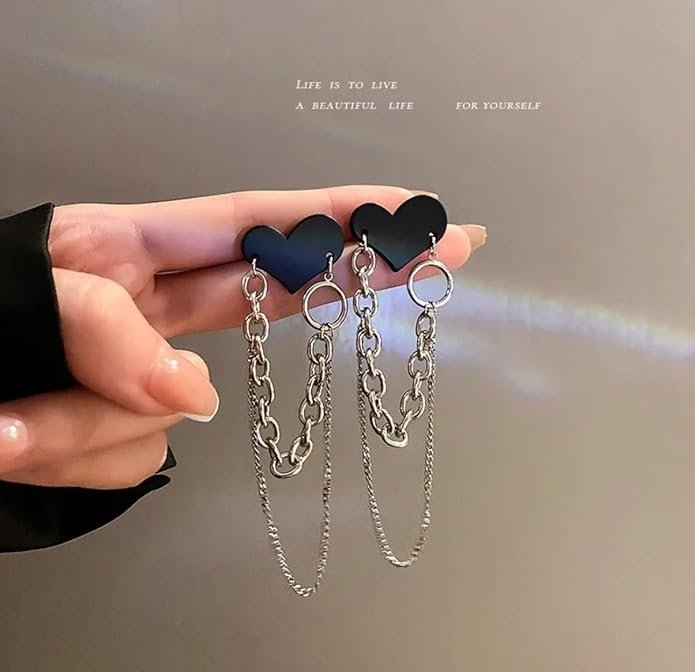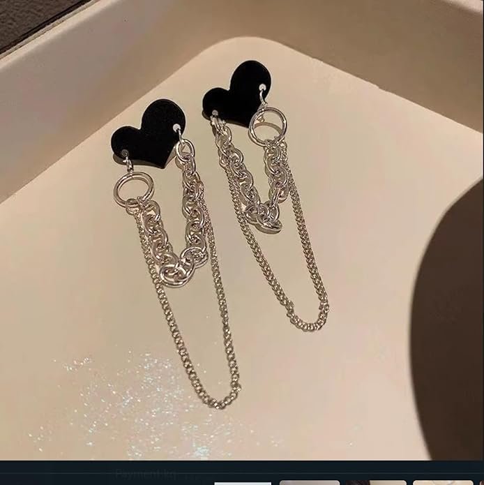Add a touch of edgy glamour to your outfit with these striking wallet chains featuring black heart accents. The silver-toned chains combine both chunky and delicate links for a distinctive aesthetic that catches the eye. Each chain showcases a bold black heart detail at the attachment points, creating a perfect blend of tough and sweet styling. The durable metal construction ensures these chains will keep your wallet secure while making a fashion statement. These versatile accessories can transform the look of any wallet, bag, or belt loop with their unique design. The combination of different chain textures adds visual interest and dimension to this practical yet stylish accessory. Perfect for adding an alternative fashion element to both casual and dressed-up ensembles.