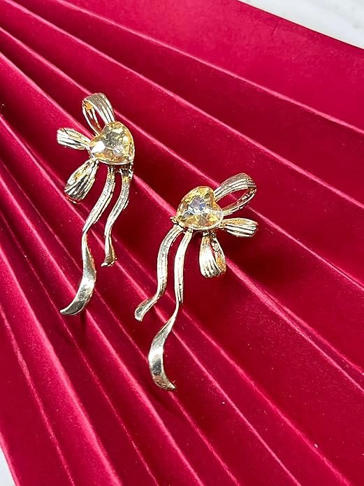 Add a touch of elegance to your jewellery collection with these stunning gold-toned bow earrings. Each earring features an exquisite design with graceful curves and flowing ribbons, centred by a sparkling amber-coloured crystal. The unique asymmetrical styling creates a dramatic, contemporary look that catches the light beautifully. These statement pieces combine vintage charm with modern sophistication, making them perfect for both special occasions and everyday wear. The lightweight construction ensures comfortable wear throughout the day, while the durable metallic finish maintains its lustre over time. These versatile earrings pair wonderfully with both traditional and western attire, adding a dash of glamour to any ensemble.
