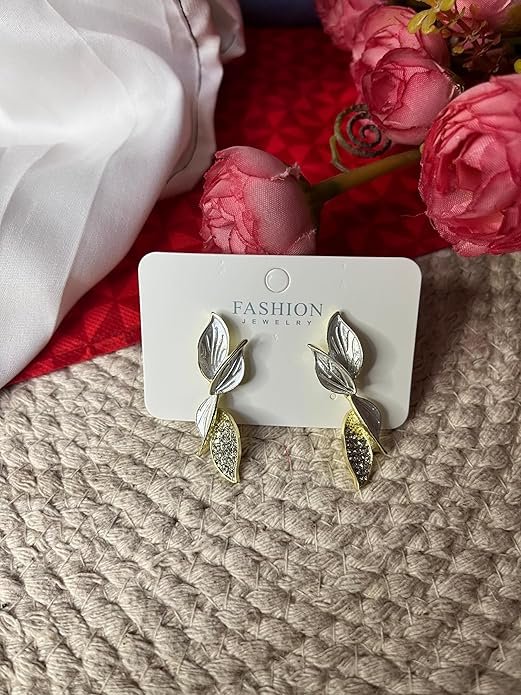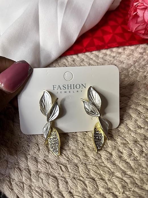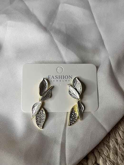 - Exquisite Design: These earrings feature a stunning leaf-inspired pattern crafted with precision, showcasing intricate metalwork with contrasting silver and gold tones.