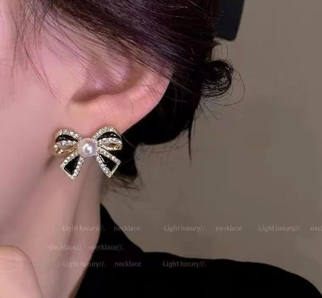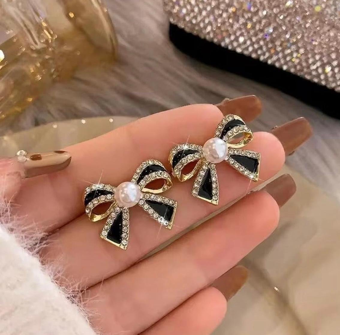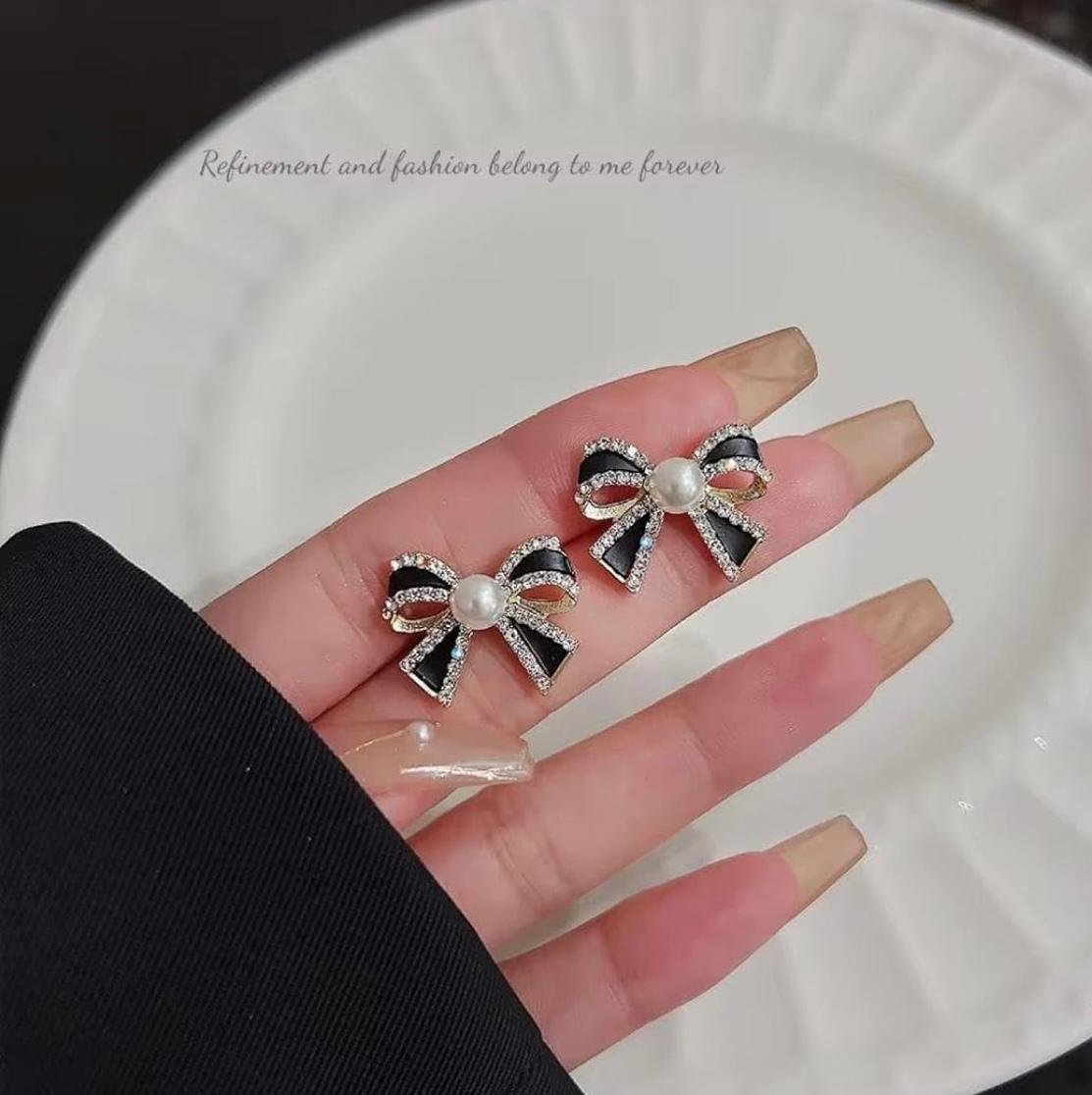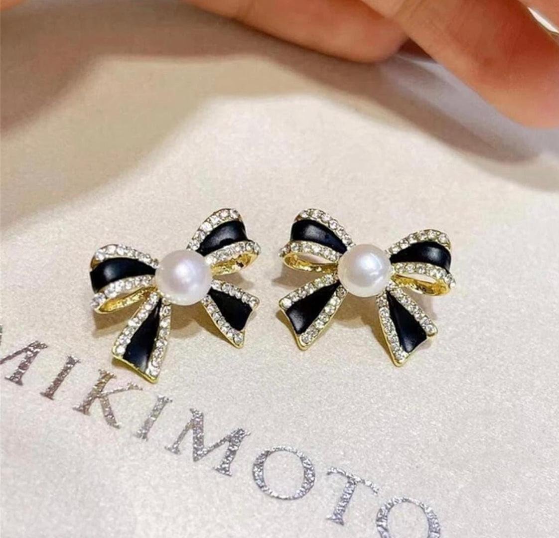 - ELEGANT DESIGN: Beautiful bow-shaped stud earrings featuring black enamel detailing, crystal embellishments, and a central white pearl, set in a polished gold-toned finish
