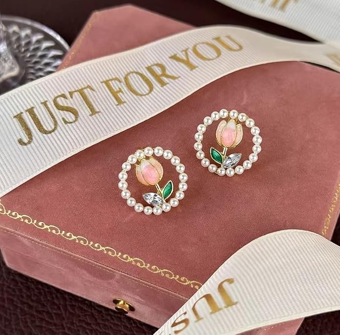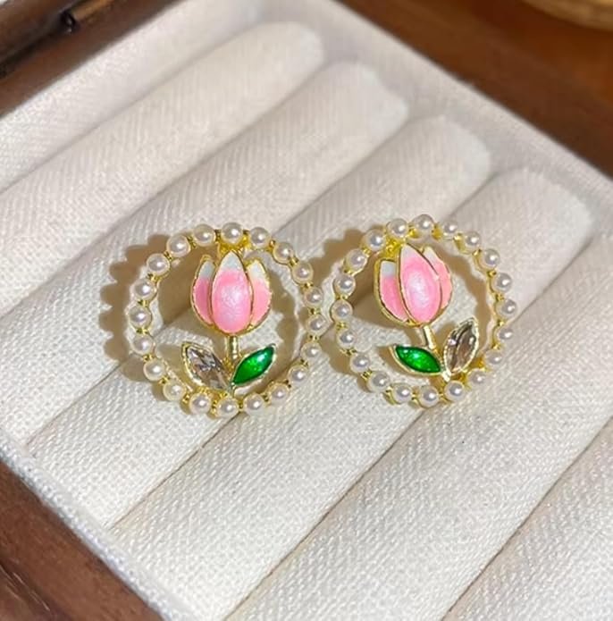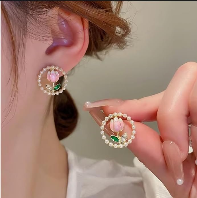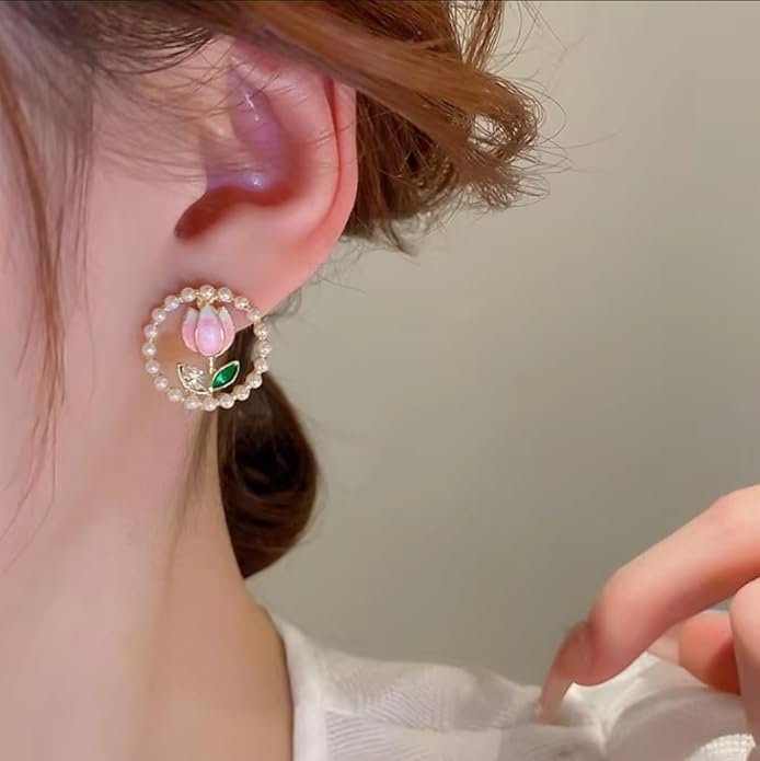 - DESIGN: Elegant pearl-encircled stud earrings featuring delicate pink tulip motifs with emerald-coloured leaves and crystal accents