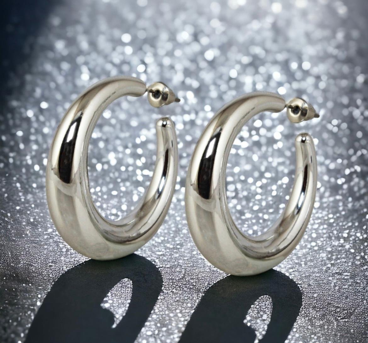 Polished Silver Tone Hoop Stud Earrings